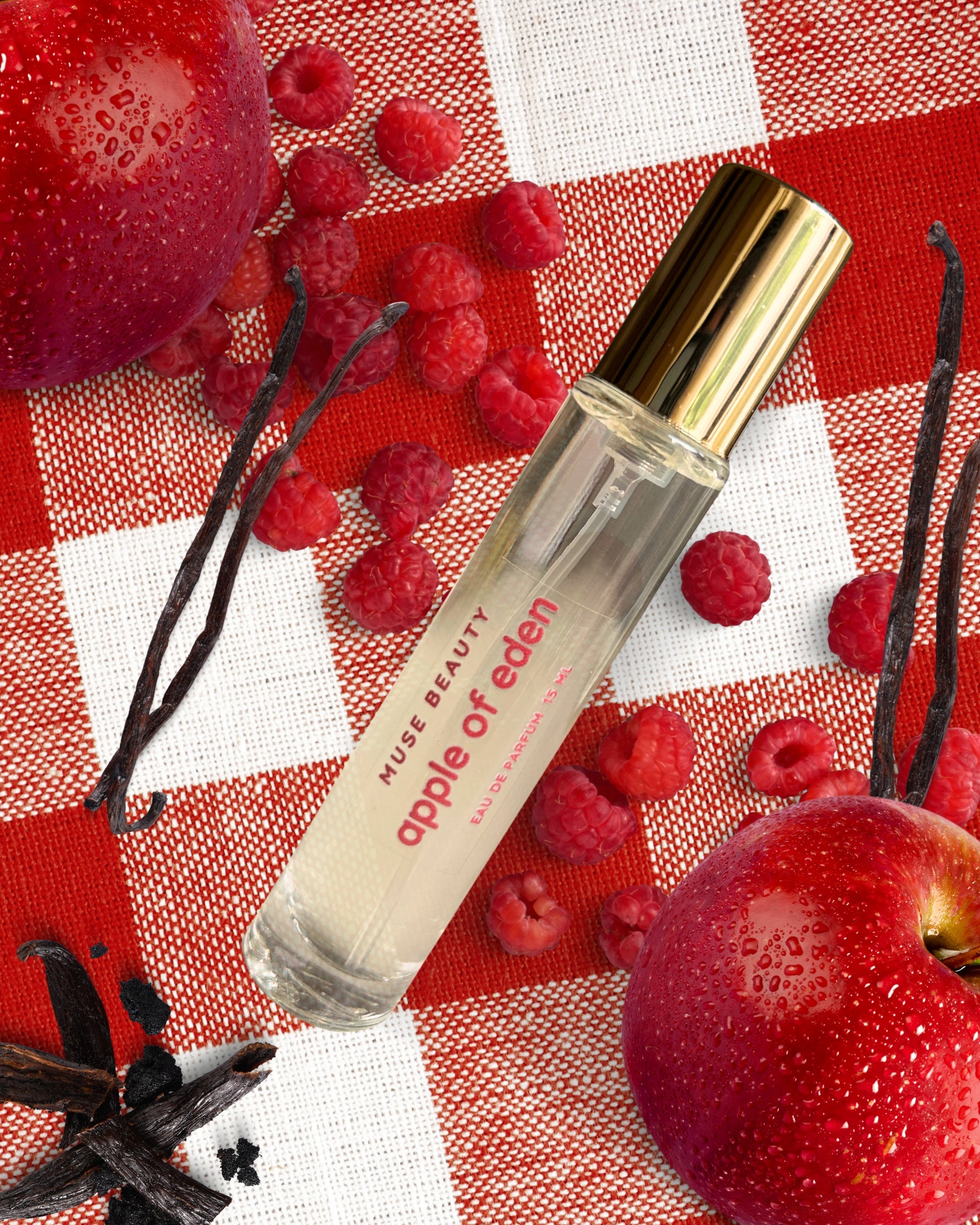 Juicy apples, wild berries, and pink grapefruit make for a mouthwatering opening, softening into raspberry florals and sweet vanilla. Apple of Eden is fresh, fruity, and feminine—an easy, flirty everyday perfume with a touch of whimsy.