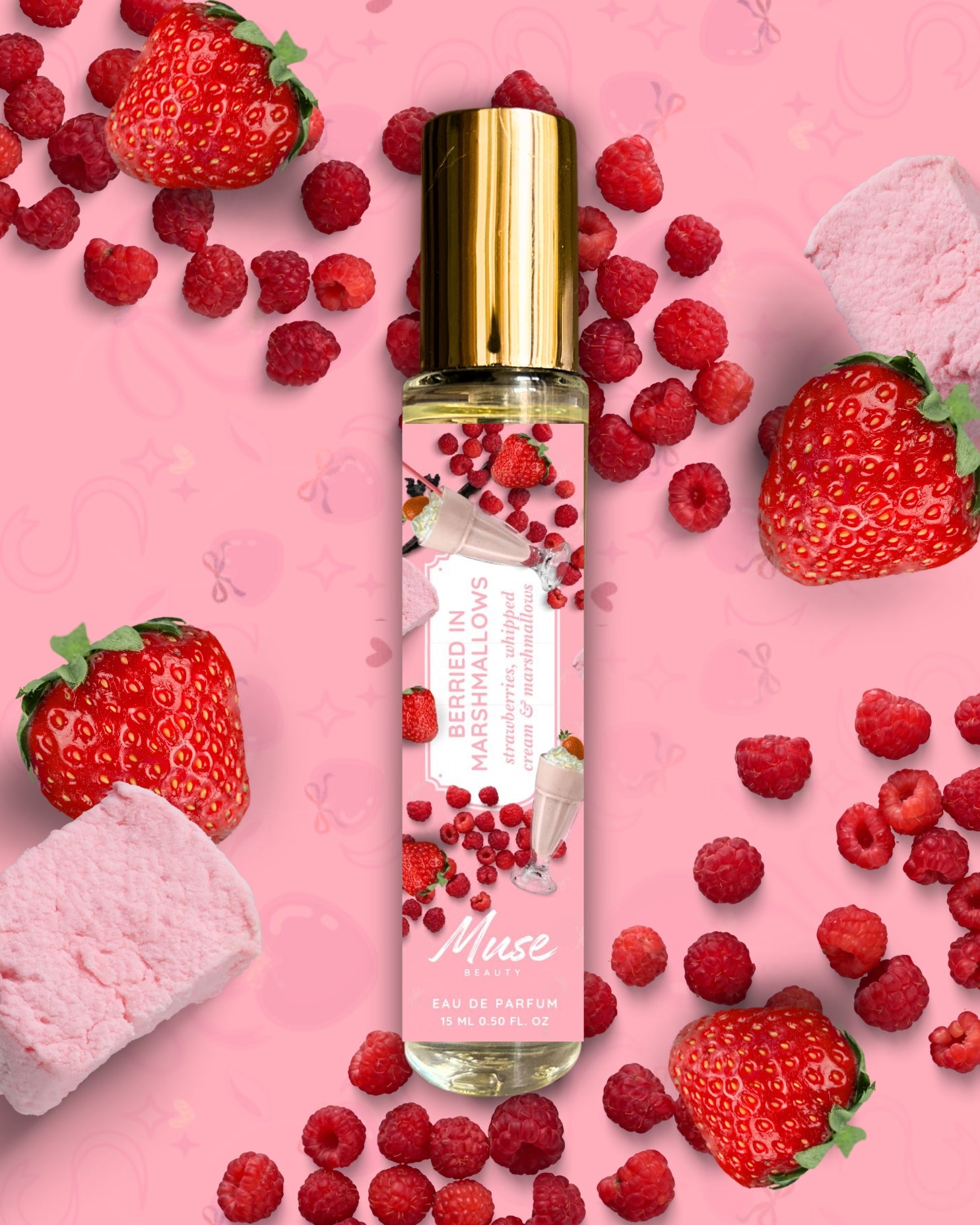 Berried in Marshmallows is a whipped sugar dream—juicy berries swirled into a strawberry milkshake, topped with clouds of vanilla whipped cream. It opens with a burst of tart raspberry and syrupy strawberry, layered over lemon zest and soft coconut. A hint of freesia cuts through the sweetness, but this is a full-blown gourmand fantasy: think melted marshmallows, candy shop sugar, and warm vanilla spun into a fluffy, fruity dessert. Perfect for those who unapologetically smell like a treat.